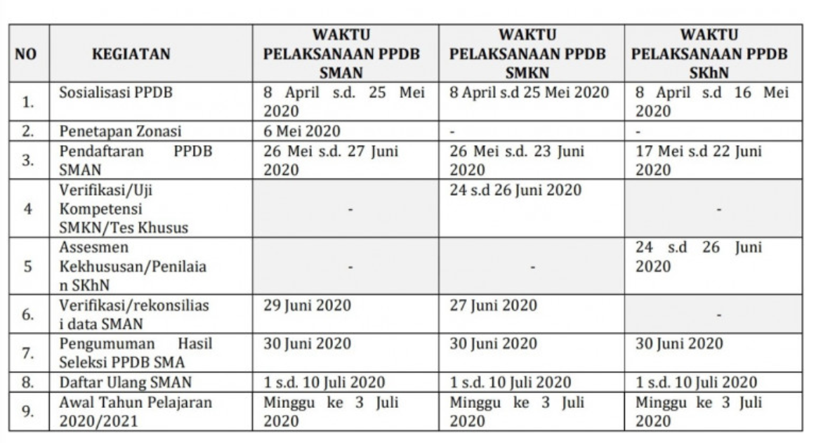 Untuk SMAN dilaksanakan dari tanggal 26 Mei – 27 Juni 2020. Rekonsiliasi data pada 30 Juni 2020. Sementara untuk SMKN dilaksanakan dari tanggal 26 Mei – 23 Juni 2020. Sedangkan jadwal uji kompetensi tanggal 24 – 27 Juni. Rekonsiliasi data pada 27 Juni 2020. Sementara untuk SKhN dilaksanakan dari tanggal 17 Mei – 22 Juni 2020. Asessment kekhususan tanggal 24 – 26 Juni 2020.