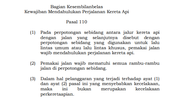 Dalam Pasal 110 Peraturan Pemerintah Nomor 72 Tahun 2009 tentang Lalu Lintas dan Angkutan KA, disebutkan bahwa pada perpotongan sebidang antara jalur KA dan jalan, pemakai jalan wajib hukumnya mendahulukan perjalanan KA.