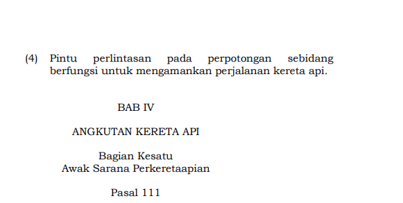 Lalu bagaimana dengan palang pintu kereta api itu sendiri? Sesuai dengan pada huruf D pada pasal tersebut menyebutkan bahwa fungsi dari palang pintu di perlintasan kereta adalah untuk mengamankan perjalanan kereta api.