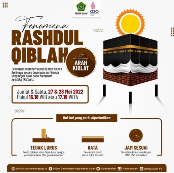 “Rashdul qiblah bisa dimanfaatkan untuk memverifikasi arah kiblat. Peristiwa alam ini terjadi pada 27 dan 28 Mei 2022 pukul 16.18 WIB atau 17.18 WITA. Bayang-bayang benda yang berdiri tegak lurus, di mana saja, akan mengarah lurus ke Ka’bah,” terang Adib di Jakarta, Selasa (24/5/2022).