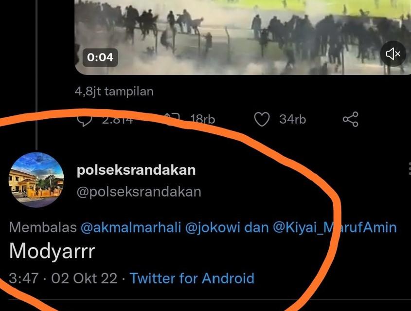 Berdasarkan pantauan Headline.co.id, dua ciuan yang dilakukan oleh mantan admin @polseksrandakan tersebut adalah “Modyarrr” dan “Salut sama pak tentara, musnah”. Dua ciutan komentar tersebut disampaikan atas tragedi di Stadiun Kanjuruan Malang.
