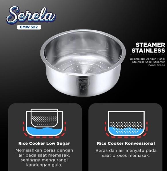 - Dilengkapi dengan fitur low sugar yang dapat membantu mengurangi kadar gula dalam nasi, sehingga sangat cocok bagi penderita diabetes atau orang yang ingin menjaga kesehatan dengan mengurangi konsumsi gula.
