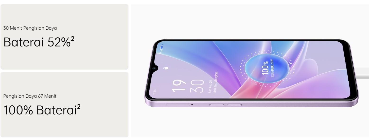 Ponsel Oppo A78 5G ini sudah didukung dengan fast carging 33W SUPERVOOCTM Flash Charge. Yang mana dapat melakkukan pengisian dengan waktu 67 menit untuk kapasitas100%.