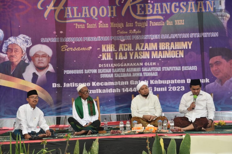 Safari Dakwah, Gus Yasin-KHR Azaim Bekali Rasa Cinta Tanah Air pada Seribuan Santri ~ Headline.co.id (Demak). Seribuan santri alumnus Pondok Pesantren Salafiyah Syafiiyah Situbondo Jawa Timur di Jawa Tengah, mengikuti Safari Dakwah KHR Ahmad Azaim Ibrahimy di Demak, Selasa (6/6/2023). Kegiatan yang bertajuk “Peran Santri Dalam Menjaga Asas Tunggal Pancasila dan NKRI” tersebut juga menghadirkan Wakil Gubernur Jawa Tengah Taj Yasin Maimoen sebagai narasumber.