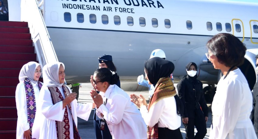 Selain itu tampak juga menyambut kehadian Ibu Iriana di bawah tangga pesawat yakni Ibu Putri Koster, Ibu Dini Triandari Apriyanto, dan Ibu Ketut Putu Jayan.