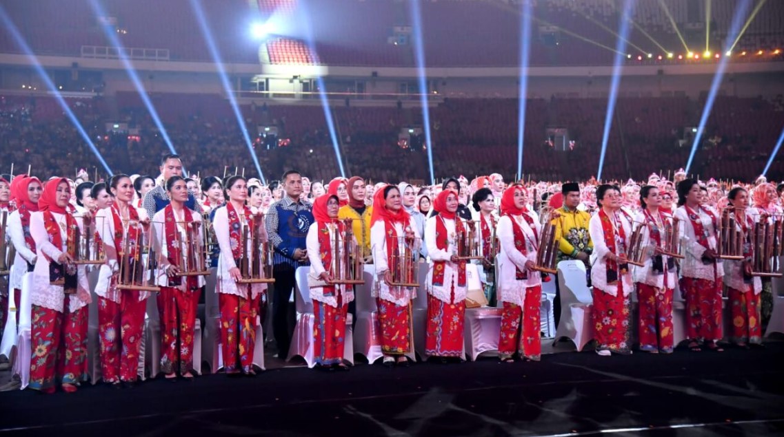 “Atas prakarsa Ibu Negara Ibu Iriana Joko Widodo, kita semua ada di sini. Sebanyak 15.240 orang peserta siap memecahkan rekor pergelaran angklung terbesar di dunia,” ucap Ketua Panitia Pergelaran Angklung, Ibu Tri Tito Karnavian dalam laporannya.
