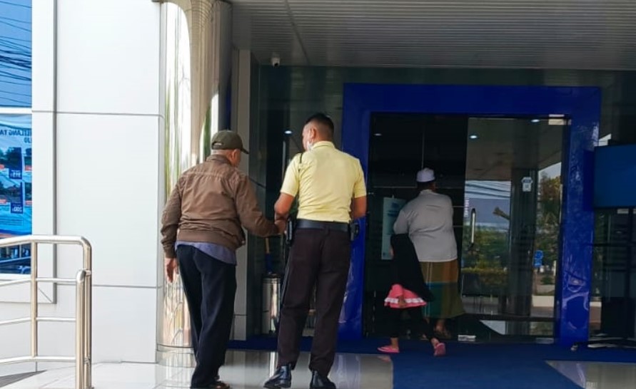 Terlihat mulai dari halaman BRI Cabang Purworejo seorang satpam dengan sabar memapah seorang kakek yang merupakan nasabah BRI masuk ke dalam ruangan.