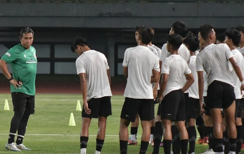Pelatih Timnas U-17 Bima Sakti memberikan arahan kepada para pemain saat latihan di Stadion Patriot Chandrabhaga, Bekasi, Jawa Barat, Senin (28/8/2023). . ANTARA FOTO/Fakhri Hermansyah - Spt.