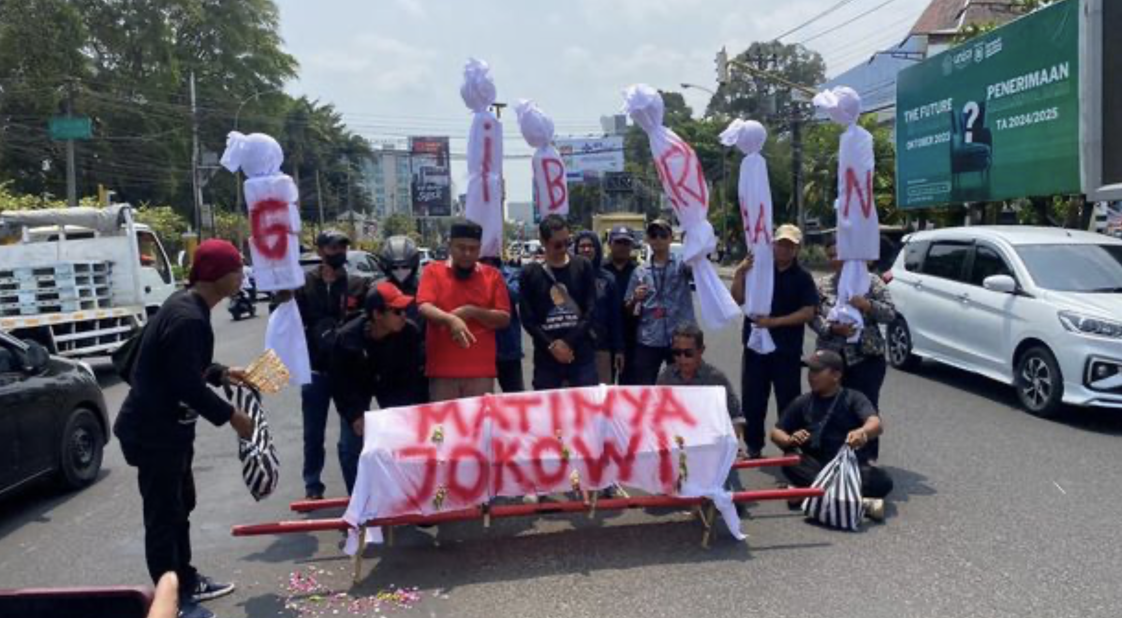 Aksi tersebut, yang dijelaskan sebagai bentuk kekecewaan, melibatkan enam boneka pocong yang masing-masing bertuliskan satu huruf dari nama Gibran. Boneka-boneka itu diikatkan pada pohon-pohon di sepanjang pembatas Jalan Laksda Adisucipto, menciptakan pemandangan yang tak lazim di tengah kota.