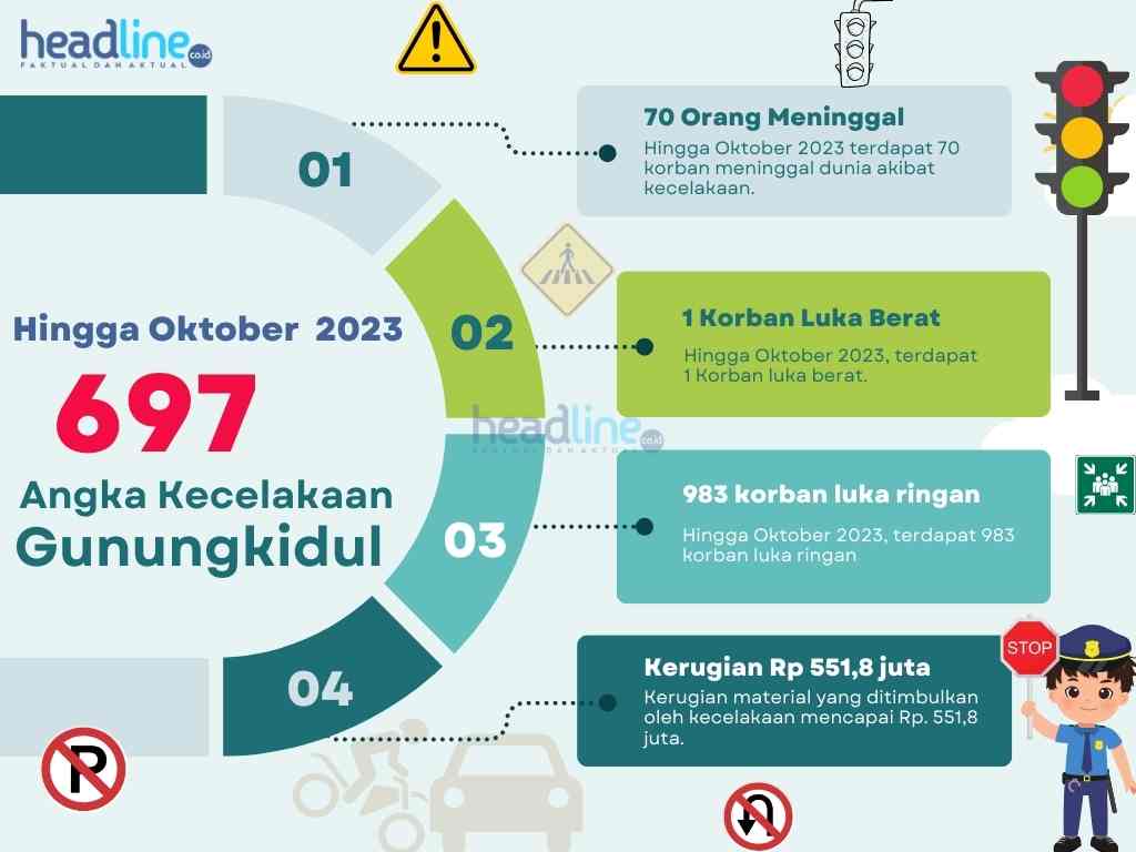 Menurut Kanit Gakkum Satlantas Polres Gunungkidul, Iptu Darmadi SH MAP, hingga Oktober 2023 tercatat 697 kecelakaan lalu lintas di jalan raya. Jumlah ini lebih sedikit dibandingkan dengan periode yang sama tahun sebelumnya, di mana pada Oktober 2022 terdapat 982 kecelakaan. Meski demikian, perhatian perlu diberikan pada korban jiwa yang mengalami peningkatan. Tahun ini, 70 orang telah kehilangan nyawa mereka dalam kecelakaan lalu lintas, sedangkan pada tahun sebelumnya, jumlah korban jiwa adalah 68 orang.