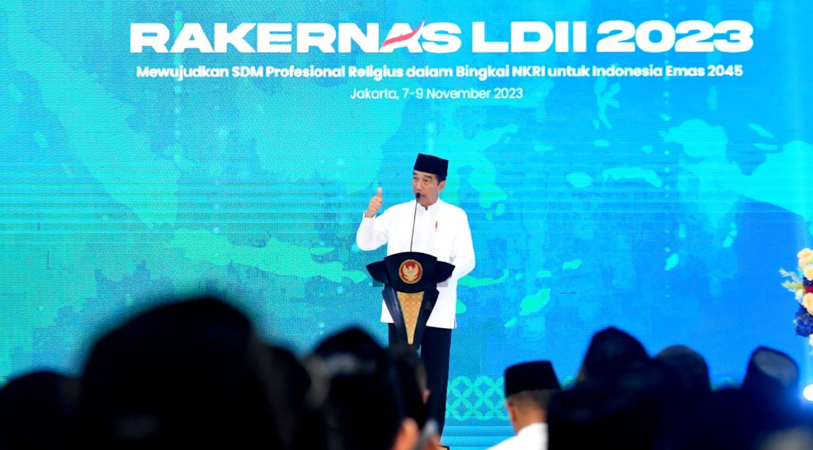 Headline.co.id (Jakarta) ~ Presiden Joko Widodo menggarisbawahi pentingnya pembangunan sumber daya manusia (SDM) sebagai kunci utama dalam mewujudkan visi besar Indonesia Emas 2045. Dalam sambutannya saat meresmikan pembukaan Rapat Kerja Nasional Lembaga Dakwah Islam Indonesia (LDII) Tahun 2023 dan peresmian Gedung Serbaguna Minhaajurrosyidiin di Grand Ballroom Gedung Serbaguna Minhaajurrosyidiin, Jakarta, pada Selasa, 7 November 2023, Presiden Jokowi memotivasi rakyatnya untuk bersatu dan berupaya dalam menghadapi tantangan di masa depan.