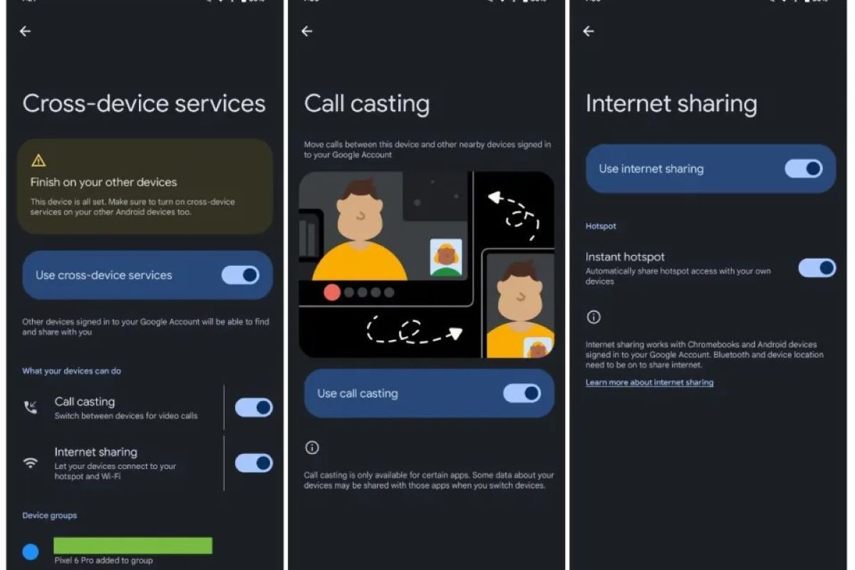 Layanan ini menghadirkan dua fitur utama: Call Casting dan Internet Sharing. Fitur Call Casting memungkinkan pengguna memindahkan panggilan video dari satu perangkat Android ke perangkat Android lainnya yang terhubung dengan akun Google yang sama. Kemampuan ini dapat diaktifkan melalui aplikasi Google Meet dengan menekan tombol “Cast”.