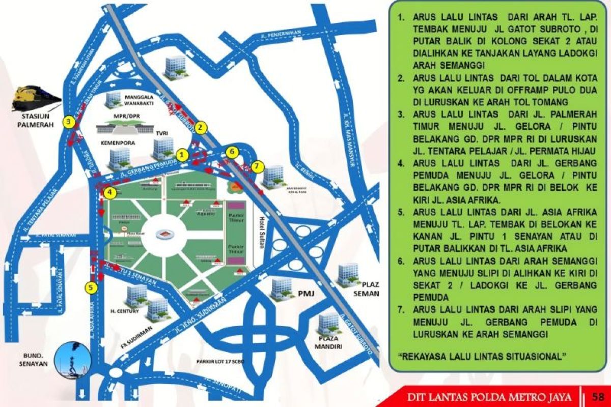 * Dari Jalan Palmerah Timur menuju Jalan Gelora atau pintu belakang Gedung DPR/MPR RI dialihkan ke Jalan Tentara Pelajar atau Jalan Permata Hijau.