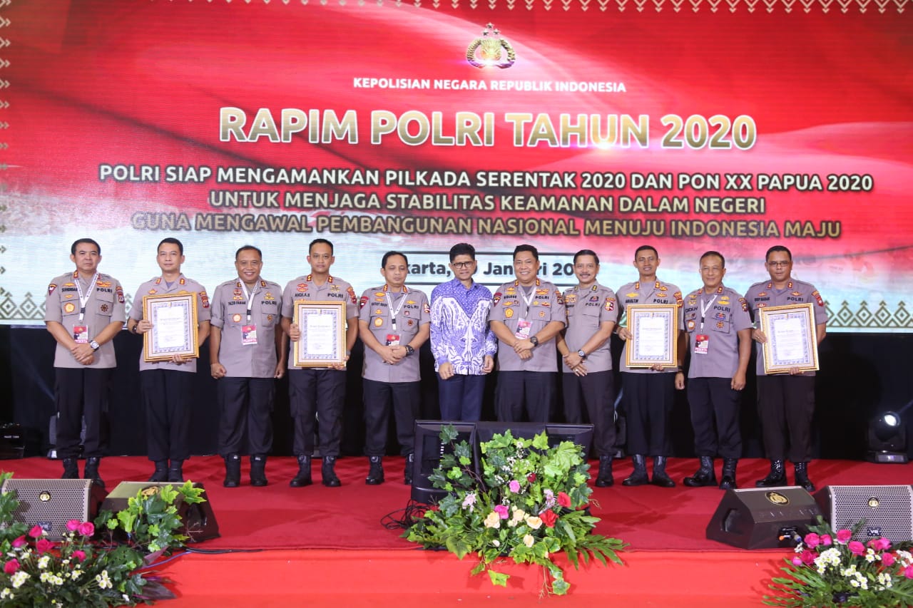 Wakapolri Komjen. Pol. Dr. Gatot Edi Pramono, M.Si., memberikan penghargaan langsung kepada Kapolres Sleman AKBP Rizky Ferdiansyah, S.H., S.I.K., didampingi Kapolda DIY Irjen. Pol. Drs. Asep Suhendar, M.Si. saat mengikuti Rapim Polri 2020 di auditorium STIK Jl. Tirta Jaya No. 6 Kebayoran Baru Jakarta Selatan, Rabu (29/02).