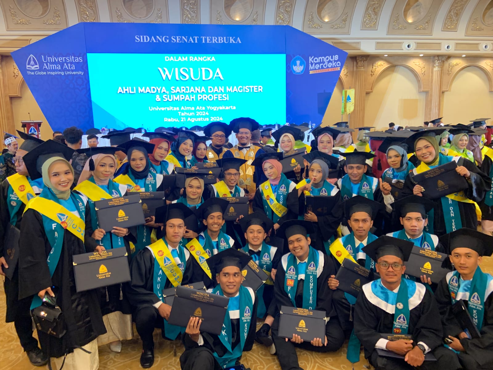 Headline.co.id (Yogyakarta) ~ Universitas Alma Ata Yogyakarta (UAA) kembali menyelenggarakan Wisuda Ahli Madya, Sarjana, dan Magister untuk Periode Agustus 2024, yang berlangsung di Kamala Ballroom, Sleman City Hall, pada Rabu (21/8/2024). Acara yang penuh khidmat ini menjadi momen bersejarah bagi 867 Wisudawan dan Wisudawati dari 20 program studi di UAA, termasuk Prodi Sistem Informasi yang turut berbangga dengan keberhasilan mahasiswanya.