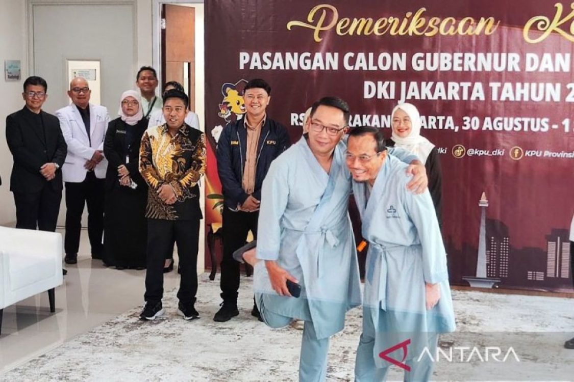 Jakarta: Pasangan calon gubernur dan calon wakil gubernur Daerah Khusus Jakarta, Ridwan Kamil dan Suswono, menjalani serangkaian pemeriksaan kesehatan pada Sabtu pagi (1/1/2023) di RSUD Tarakan Jakarta.