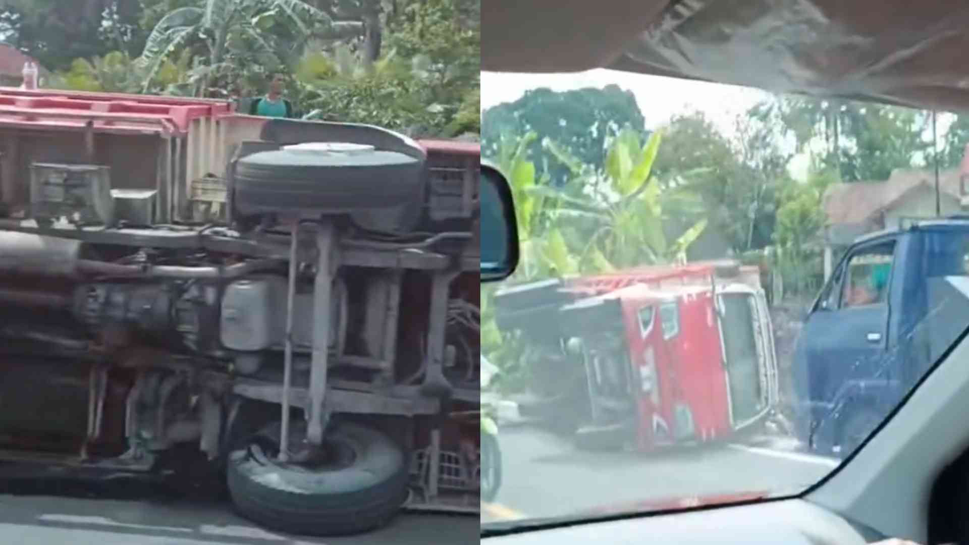 Kronologi kejadian menyebutkan bahwa truk yang melaju dari arah selatan menuju utara mengalami masalah ketika mendekati lokasi kejadian. Ban kiri belakang bagian luar truk tersebut pecah, menyebabkan kendaraan oleng dan akhirnya terguling di sisi jalan.
