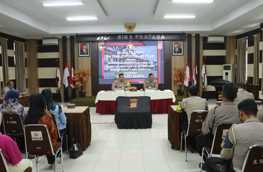 Kedatangan tim Puslitbang Polri, yang dipimpin oleh Kombes Pol. Cahyo Widagdo, S.St, M.K., disambut hangat oleh Kapolres Bantul, AKBP Michael R. Risakotta, beserta jajarannya. Penelitian dilakukan dengan metode campuran (mix method) yang melibatkan penyebaran angket kuantitatif serta diskusi dan wawancara mendalam dengan responden, baik dari kalangan internal maupun eksternal Polri.