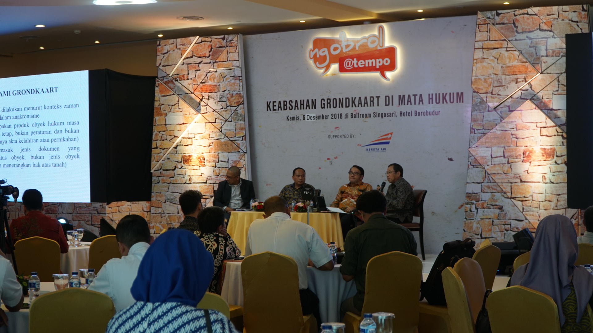 Begini Keabsahan Grondkaart di Mata Hukum ~ Headline.co.id (Jakarta). Kamis, 6 Desember 2018 telah dilakukan Ngobrol @Tempo dengan materi Keabsahan Grondkaart di Mata Hukum. Acara yang dilasanakan di Hotel Borobudur Jakarta tersebut dihadiri sekitar 150 orang yang terdiri dari BPN, Kepolisian, Kejaksaaan Wilayah, dan perwakilan dari sejumlah BUMN yang lahannya banyak memakai Grondkaart sebagai bukti kepemilikan.