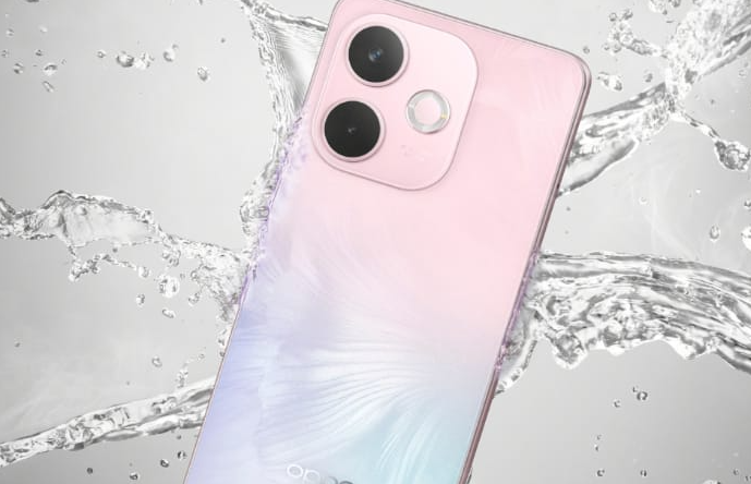 • Terdapat logo Oppo di bagian tengah bawah dengan susunan dual kamera dan flash yang menyatu dengan desain, disertai tulisan “AI Kamera” yang menyala saat flash diaktifkan.