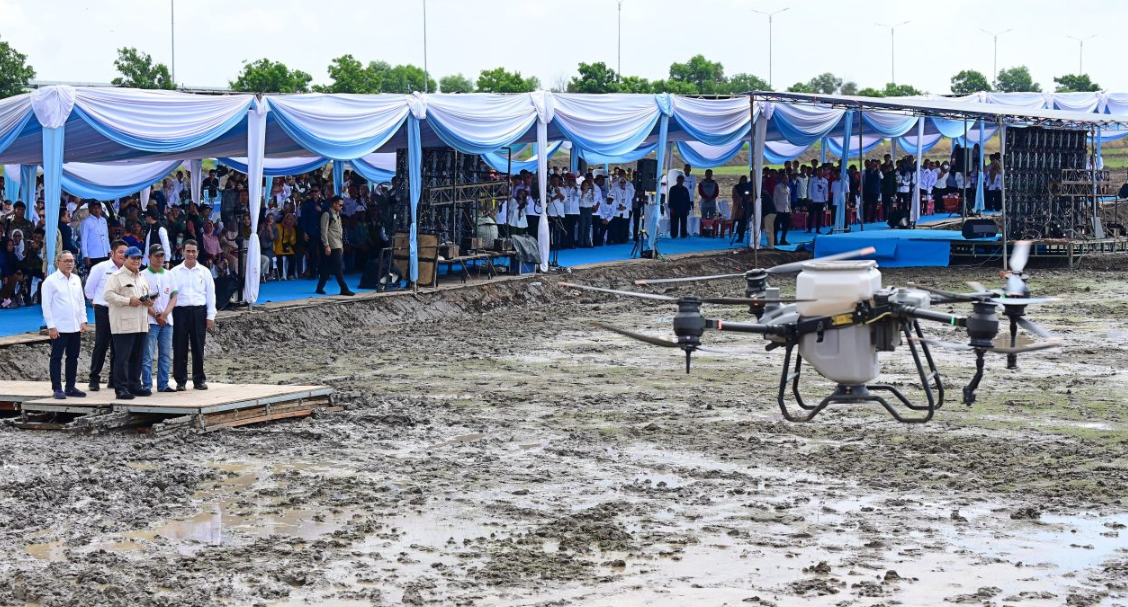 Dalam kesempatan itu, Kepala Negara juga menjajal langsung teknologi penebaran benih padi menggunakan drone DJI Agras T40. Dengan antusias, Presiden membandingkan efisiensi teknologi dengan cara konvensional.