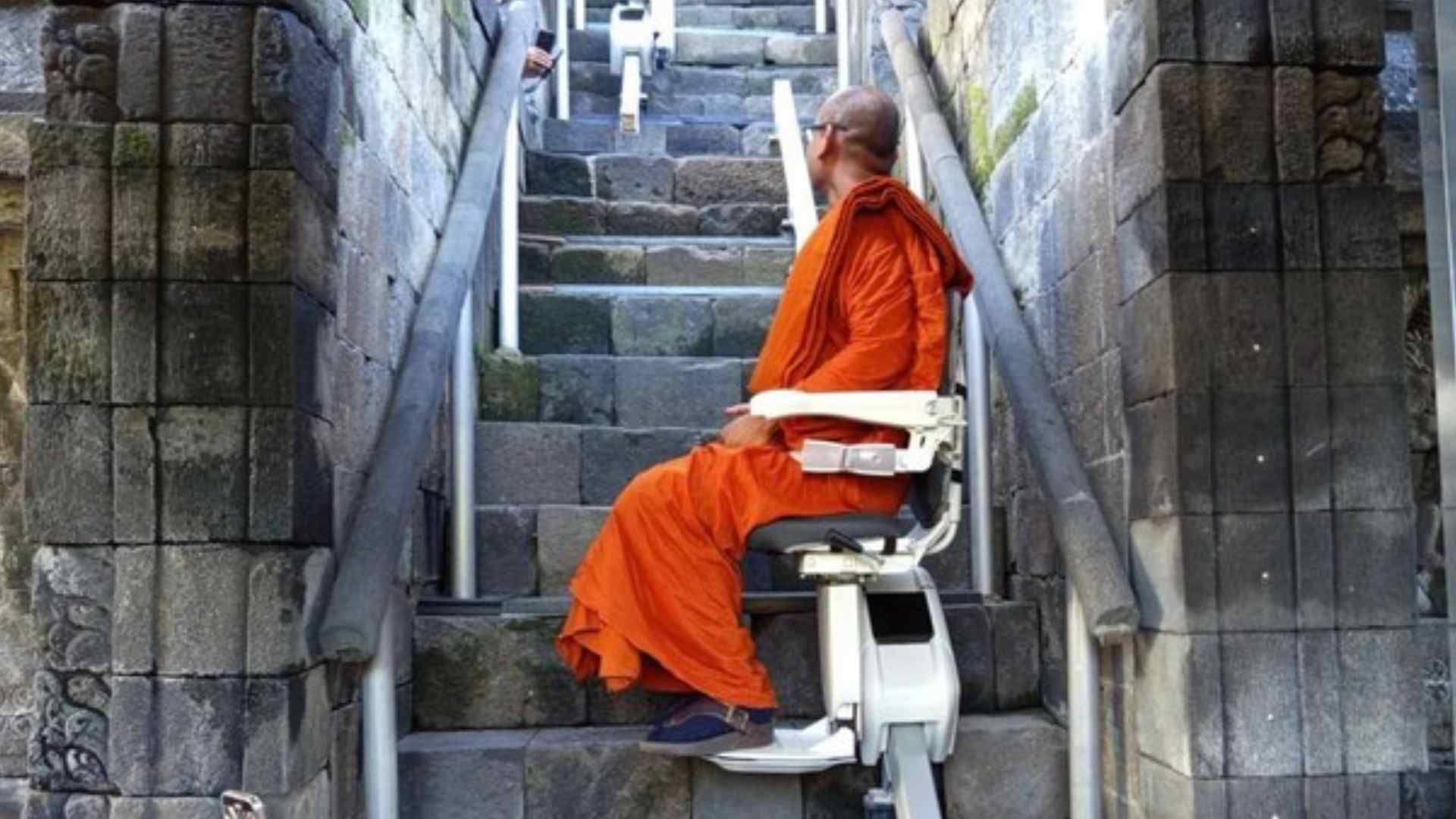 Tanto yang mengalami gangguan kaki pascaoperasi menyebut kehadiran stairlift sangat membantunya dalam naik ke area atas Candi Borobudur. “Dan satu kata yang saya katakan, luar biasa. Jadi kaki saya yang biasa sakit, sekarang naik tidak terasa karena naik stairlift ya,” ujar Tanto yang mengaku hampir setiap pekan naik ke candi untuk mendampingi tamu atau umat Buddha.