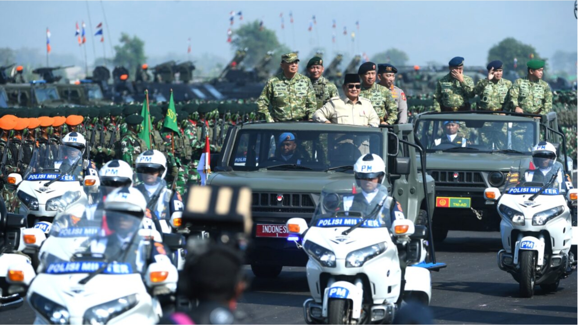 Didampingi Panglima TNI serta para Kepala Staf Angkatan, Presiden meninjau barisan prajurit dari berbagai matra menggunakan kendaraan taktis. Ia mengapresiasi disiplin dan semangat juang pasukan.