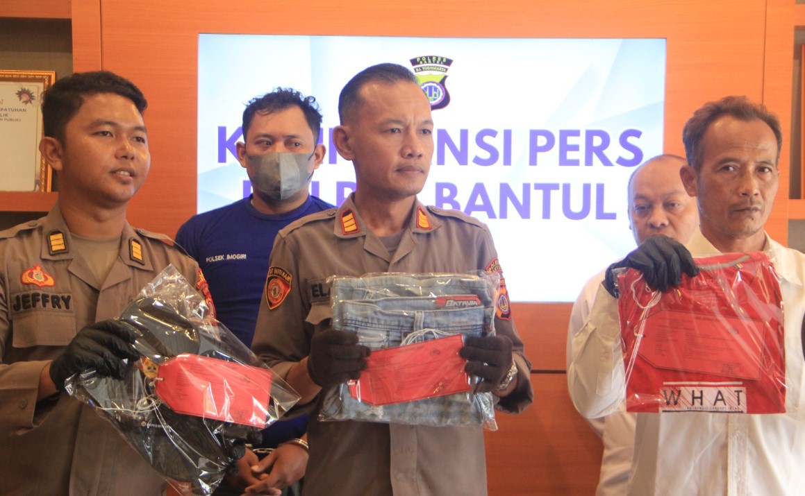 Personel Polres Bantul menunjukkan barang bukti pakaian yang digunakan pelaku pencurian beras 30 kilogram di Imogiri, dalam gelaran konferensi pers pengungkapan kasus tersebut.