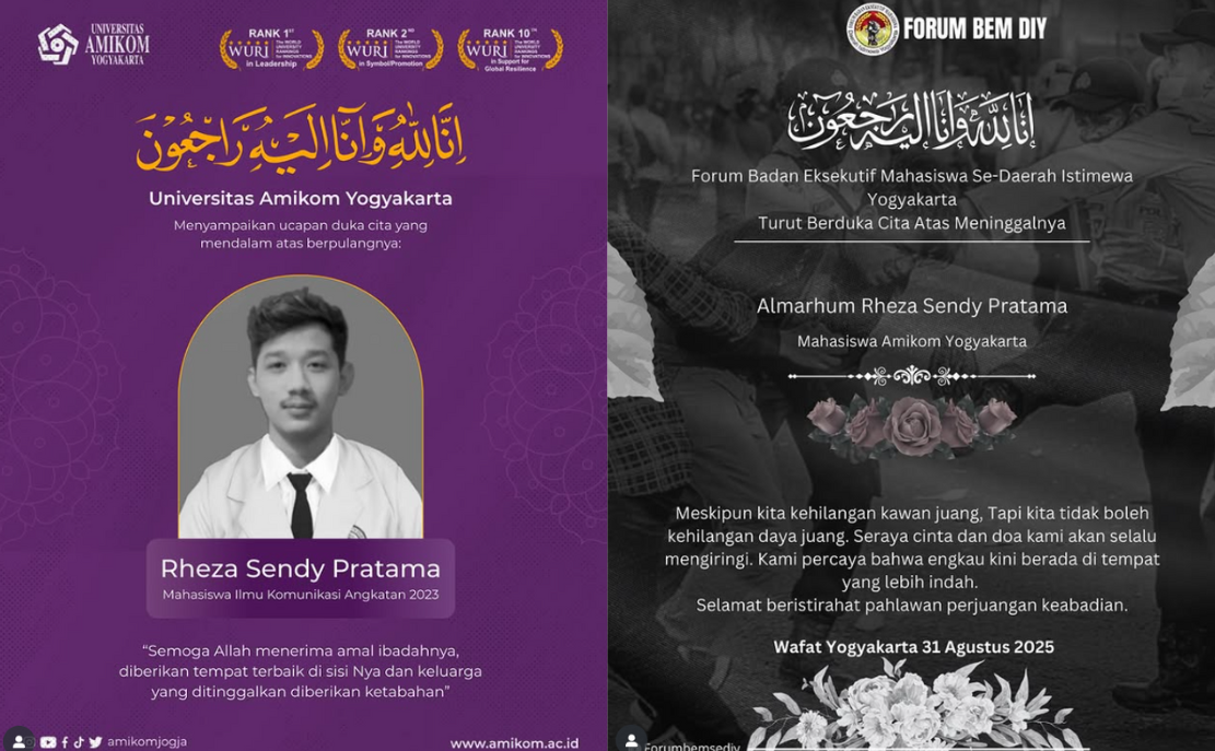 Headline.co.id (Jogja) ~ Seorang mahasiswa Universitas Amikom Yogyakarta bernama Rheza Sendy Pratama meninggal dunia saat mengikuti aksi demonstrasi di depan Markas Polda DIY pada Minggu (31/8/2025). Rheza, mahasiswa S1 Ilmu Komunikasi, dilaporkan terpapar gas air mata dan terjatuh dari sepeda motor yang dikendarainya. Insiden tersebut membuat situasi unjuk rasa yang sebelumnya sudah memanas semakin menyisakan duka mendalam.