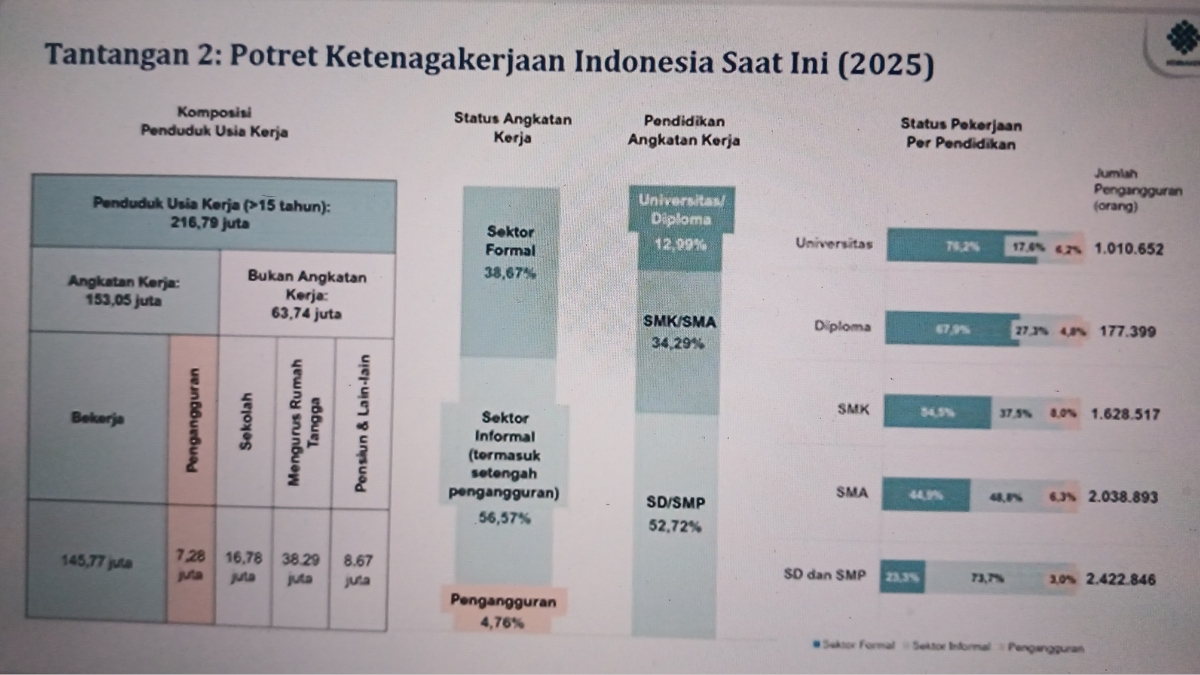 Dengan lebih dari 70 persen penduduk Indonesia berada di usia produktif, Yassierli menilai momentum bonus demografi harus dikelola secara produktif agar menjadi bonus ekonomi yang nyata. Namun, ia mengingatkan adanya tantangan besar di lapangan: sekitar 85 persen tenaga kerja Indonesia masih berpendidikan maksimal SMA/SMK dan 60 persen di antaranya bekerja di sektor informal.