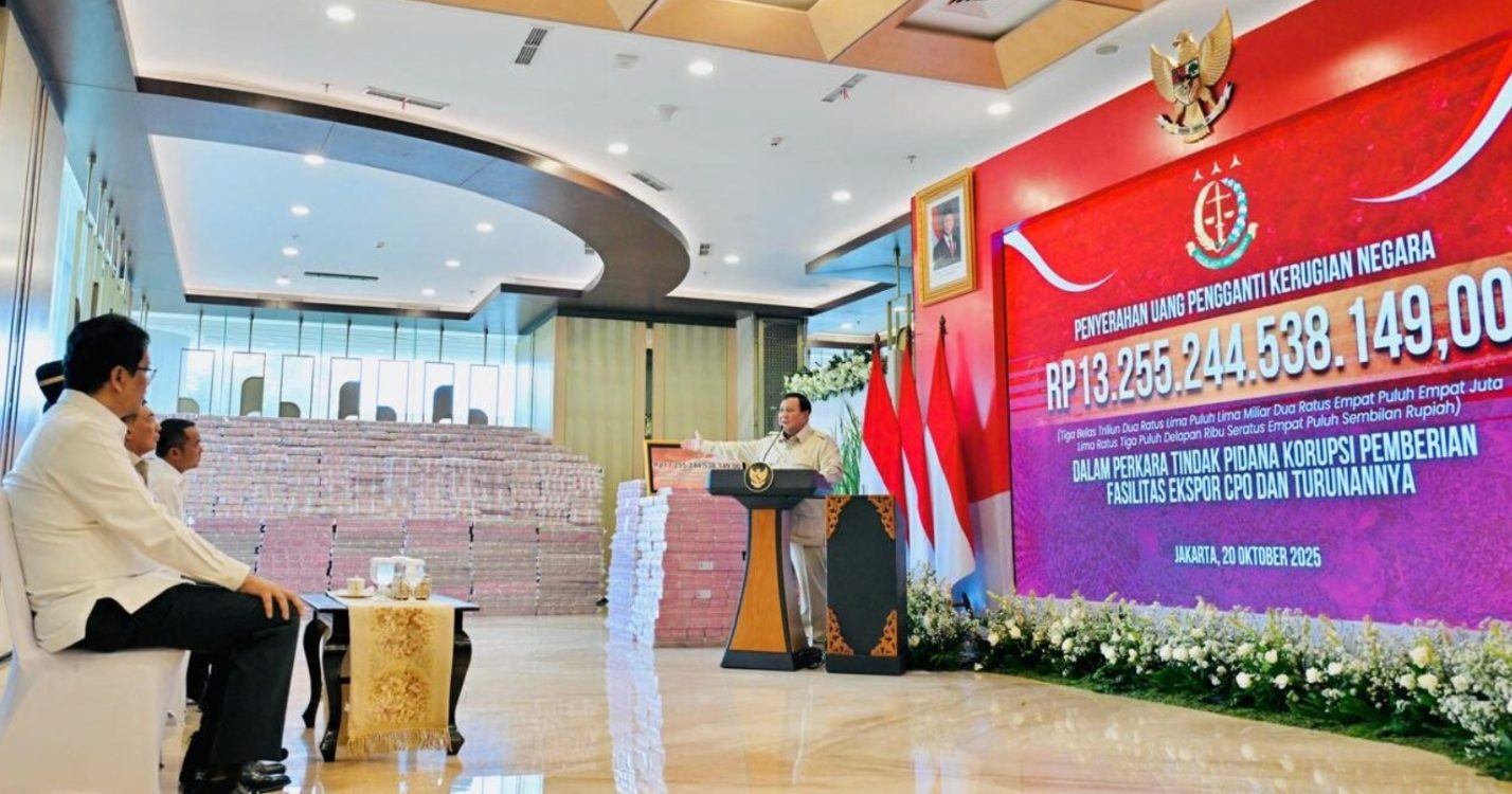 Headline.co.id (Jakarta) — Presiden Prabowo Subianto menegaskan pentingnya penegakan hukum yang berkeadilan, berintegritas, dan berlandaskan hati nurani. Pernyataan tersebut disampaikan saat menyaksikan penyerahan uang pengganti kerugian negara sebesar Rp13,25 triliun dalam perkara tindak pidana korupsi fasilitas ekspor Crude Palm Oil (CPO) dan turunannya dari Kejaksaan Agung kepada Kementerian Keuangan di Gedung Utama Kompleks Kejaksaan Agung RI, Jakarta, Senin (20/10/2025).