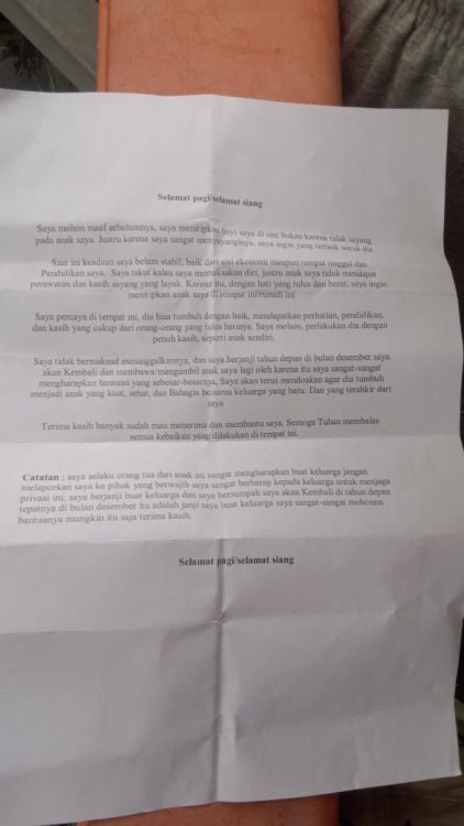 “Saya menitipkan bayi saya di sini bukan karena tidak sayang pada anak saya. Justru karena saya sangat menyayanginya dan ingin yang terbaik untuk dia,” tulis sang ibu dalam surat tersebut.
