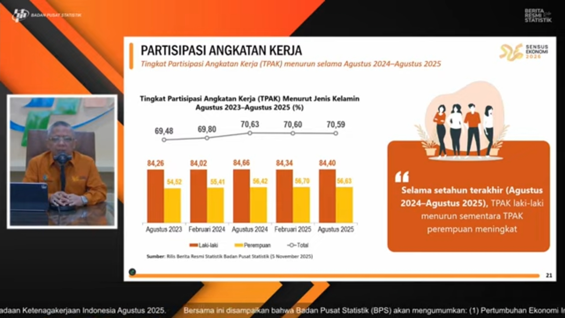 Headline.co.id, Jakarta ~ Badan Pusat Statistik (BPS) melaporkan bahwa ekonomi Indonesia mengalami pertumbuhan sebesar 5,04 persen pada triwulan ketiga tahun 2025. Angka ini menunjukkan peningkatan dibandingkan periode yang sama tahun sebelumnya yang mencatatkan pertumbuhan 4,95 persen. Deputi Bidang Neraca dan Analisis Statistik BPS, Moh. Edy Mahmud, dalam konferensi pers pada Rabu (5/11/2025), menyatakan bahwa pertumbuhan ini didorong oleh konsumsi masyarakat yang tetap stabil.