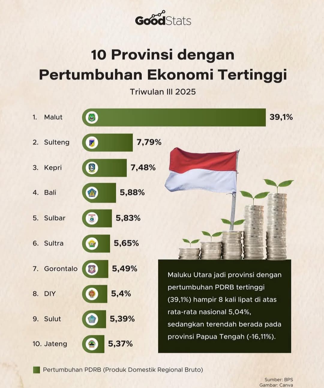 Headline.co.id, Gorontalo ~ Provinsi Gorontalo mencatatkan pertumbuhan ekonomi yang signifikan pada Triwulan III 2025, di bawah kepemimpinan Gubernur Gusnar Ismail dan Wakil Gubernur Idah Syahidah Rusli Habibie. Berdasarkan data dari Badan Pusat Statistik (BPS) yang dirilis oleh goodstats pada Sabtu, 8 November 2025, Produk Domestik Regional Bruto (PDRB) Gorontalo tumbuh sebesar 5,49 persen. Pertumbuhan ini menempatkan Gorontalo di posisi ketujuh dalam daftar 10 provinsi dengan pertumbuhan ekonomi tertinggi di Indonesia.