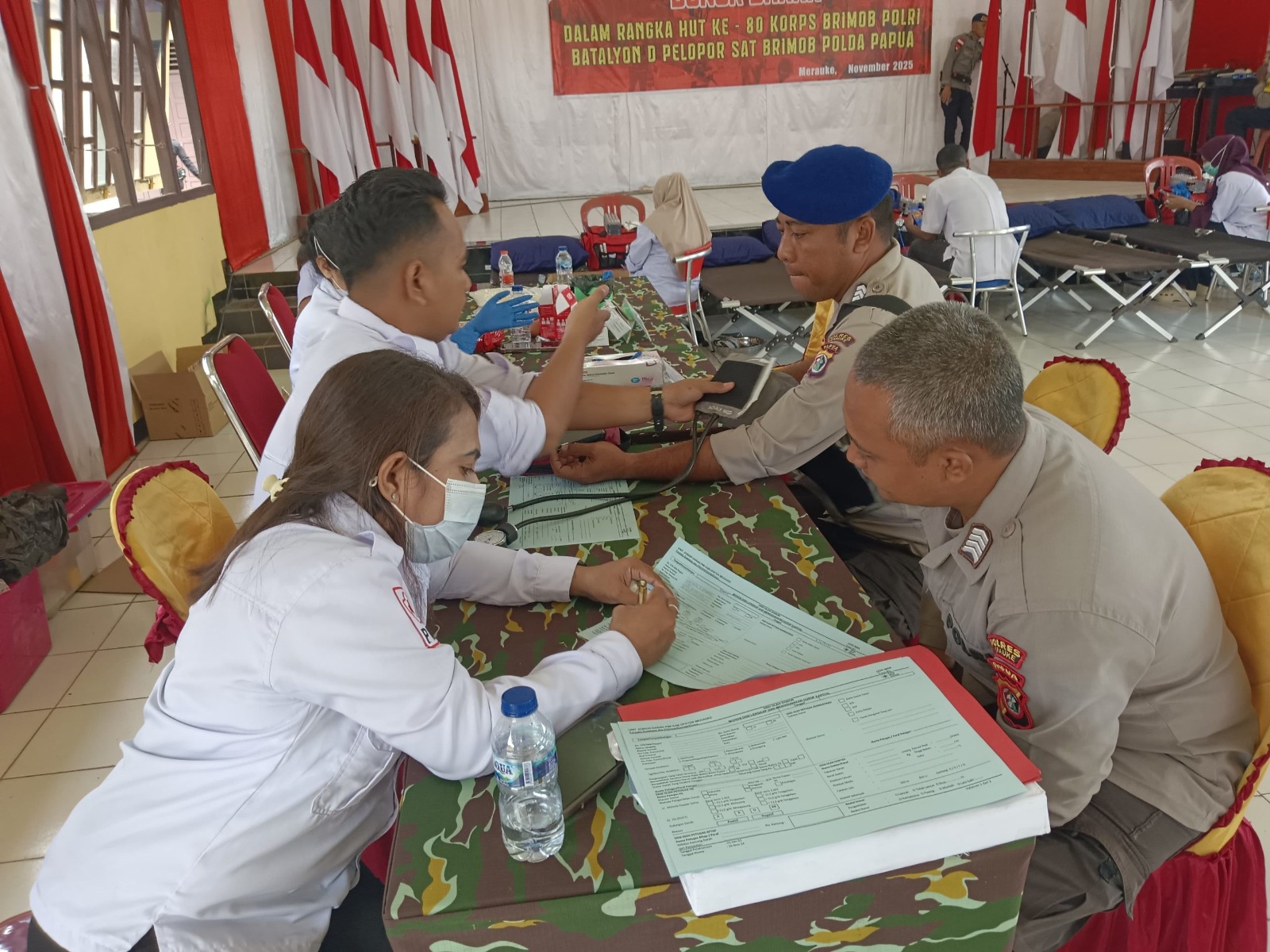 Headline.co.id, Merauke ~ Dalam rangka memperingati Hari Ulang Tahun ke-80 Korps Brimob Polri, Satuan Polisi Air dan Udara (Sat PD olairud) Polres Merauke turut serta dalam kegiatan donor darah yang diselenggarakan oleh Korps Brimob Polri Batalyon D Pelopor Polda Papua. Acara ini berlangsung di Markas Komando Brimob Batalyon D Pelopor Merauke pada Selasa, 11 November 2025. Kegiatan ini merupakan bentuk dukungan dan kepedulian Sat Polairud Polres Merauke terhadap perayaan HUT Brimob, serta kontribusi nyata dalam membantu memenuhi kebutuhan stok darah di Palang Merah Indonesia (PMI) Merauke.