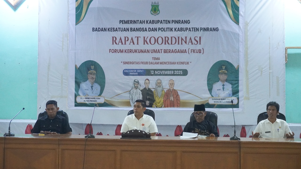 Headline.co.id, Jakarta ~ Pemerintah Kabupaten Pinrang mengadakan Rapat Koordinasi Forum Kerukunan Umat Beragama (FKUB) untuk memperkuat toleransi dan kerukunan antarumat beragama. Acara ini berlangsung di Ruang Pola Kantor Bupati Pinrang pada Rabu, 12 November 2025, dan dibuka oleh Pelaksana Tugas (Plt.) Kepala Badan Kesatuan Bangsa dan Politik (Kesbangpol) Kabupaten Pinrang, A. Haswidy Rustam.