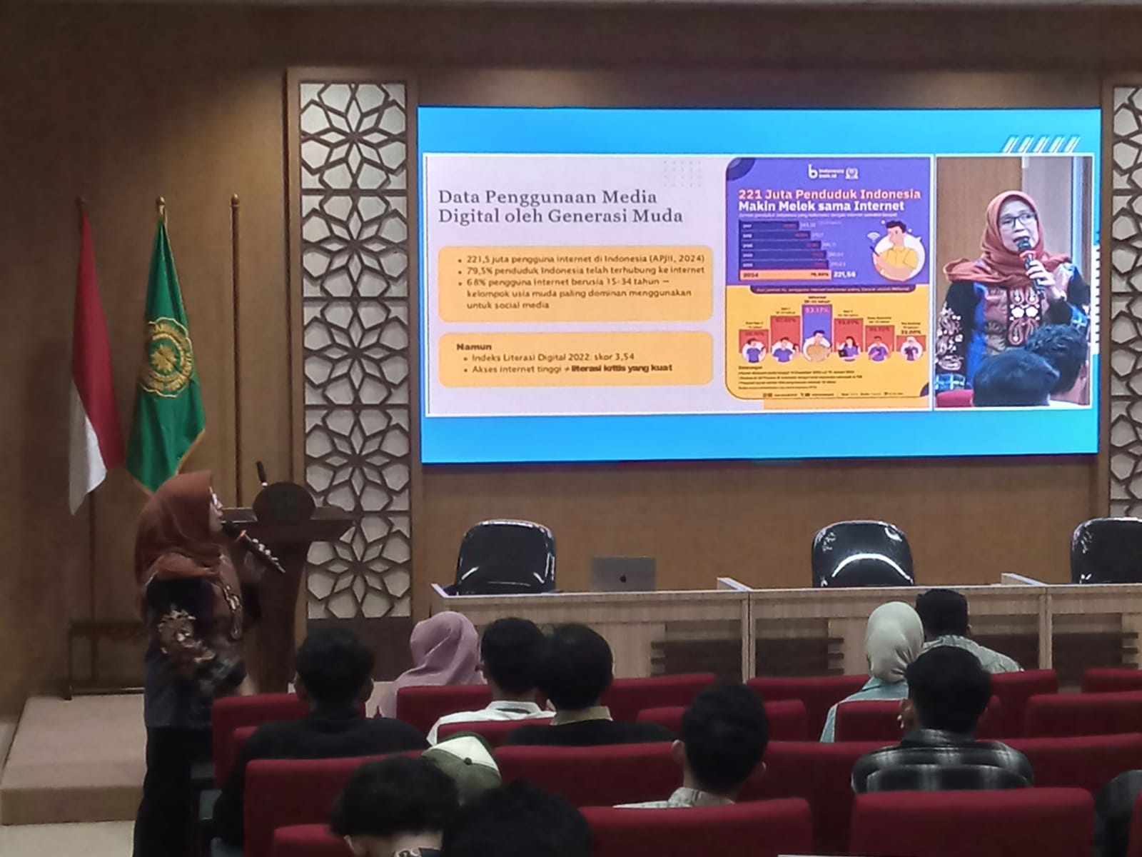 Dalam presentasinya yang berjudul “Generasi Muda: Melek Digital dan Beretika untuk Indonesia Emas”, Prof. Adhianty menekankan pentingnya peran generasi muda dalam membentuk masa depan digital Indonesia. Ia mengungkapkan bahwa pengguna internet di Indonesia telah mencapai 221,5 juta orang, atau sekitar 79,3 persen dari total populasi. “Jumlah ini menunjukkan betapa besar potensi yang dimiliki Indonesia dalam dunia digital,” ujarnya.