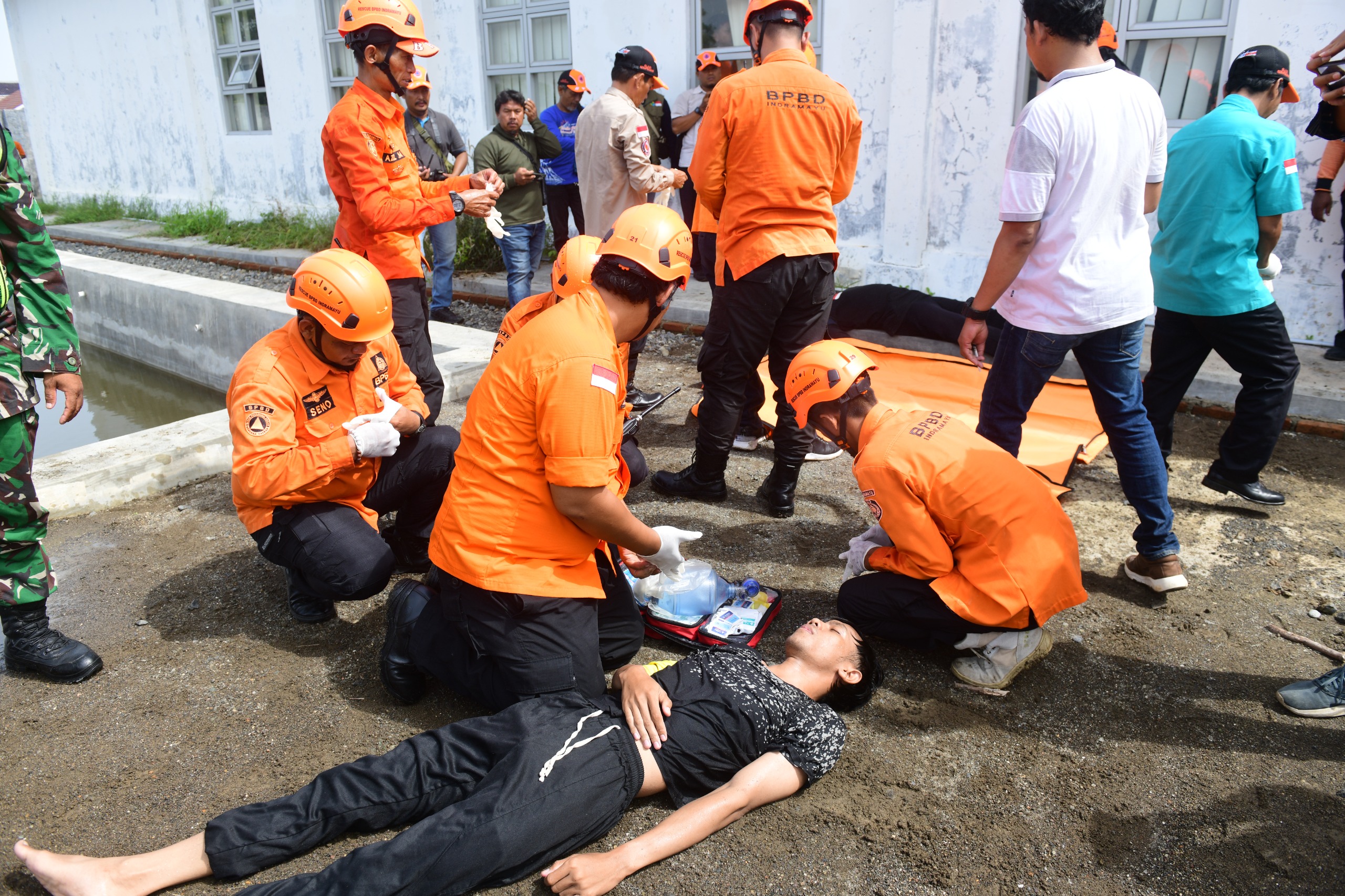 Puncak dari acara apel siaga tersebut adalah gladi simulasi penanganan bencana yang melibatkan skenario evakuasi korban banjir dan tanggap darurat. (Mc Indramayu/Aa Deni)
