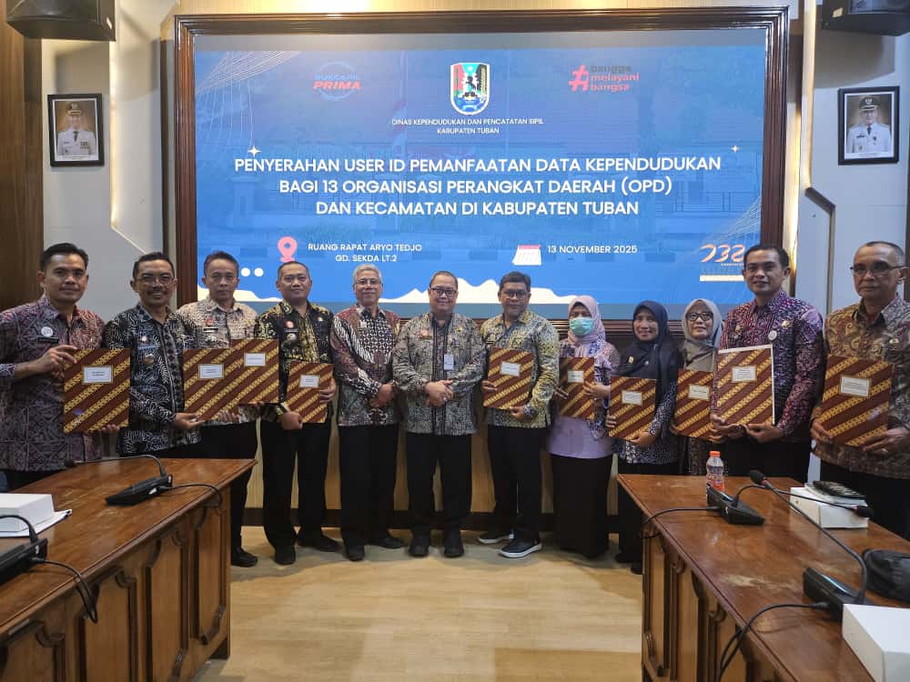 Headline.co.id, Tuban ~ Pemerintah Kabupaten Tuban mengambil langkah signifikan dalam meningkatkan layanan publik dengan menyerahkan User ID Pemanfaatan Data Kependudukan kepada 13 Organisasi Perangkat Daerah (OPD) dan kecamatan. Penyerahan ini dilakukan pada Kamis, 13 November 2025, di Ruang Rapat Aryo Tejo, Sekretariat Daerah Kabupaten Tuban. Langkah ini memungkinkan instansi terkait untuk mengakses data kependudukan terverifikasi sebagai dasar dalam memberikan layanan.