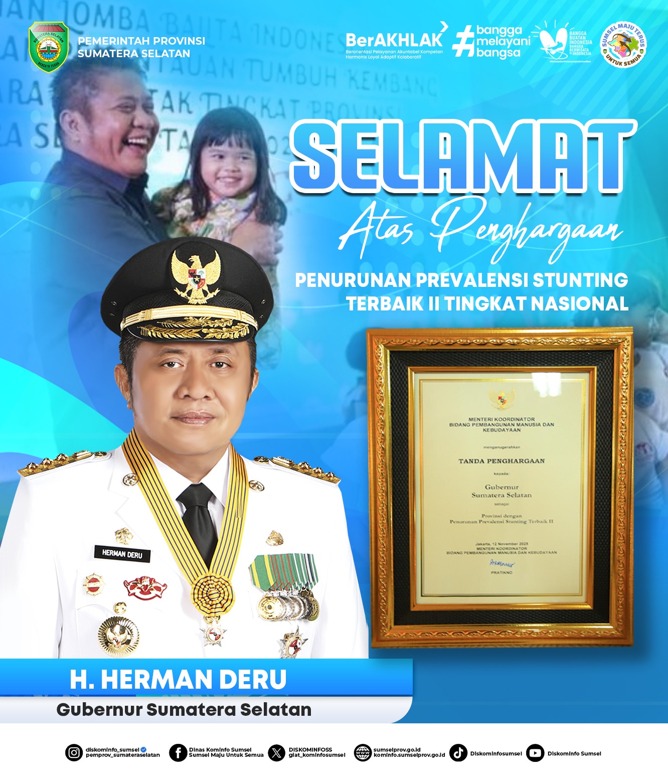 Headline.co.id, Jakarta ~ Provinsi Sumatra Selatan (Sumsel) berhasil meraih penghargaan nasional atas upayanya dalam menurunkan angka stunting. Sumsel dianugerahi Tanda Penghargaan dari Presiden Republik Indonesia sebagai Terbaik II Tingkat Nasional dalam Penurunan Prevalensi Stunting. Penghargaan ini diterima oleh Kepala Dinas Kesehatan Provinsi Sumatra Selatan, Trisnawarman, dalam acara yang berlangsung di Gedung Kementerian Kesehatan, Jakarta, pada Rabu (12/11/2025).