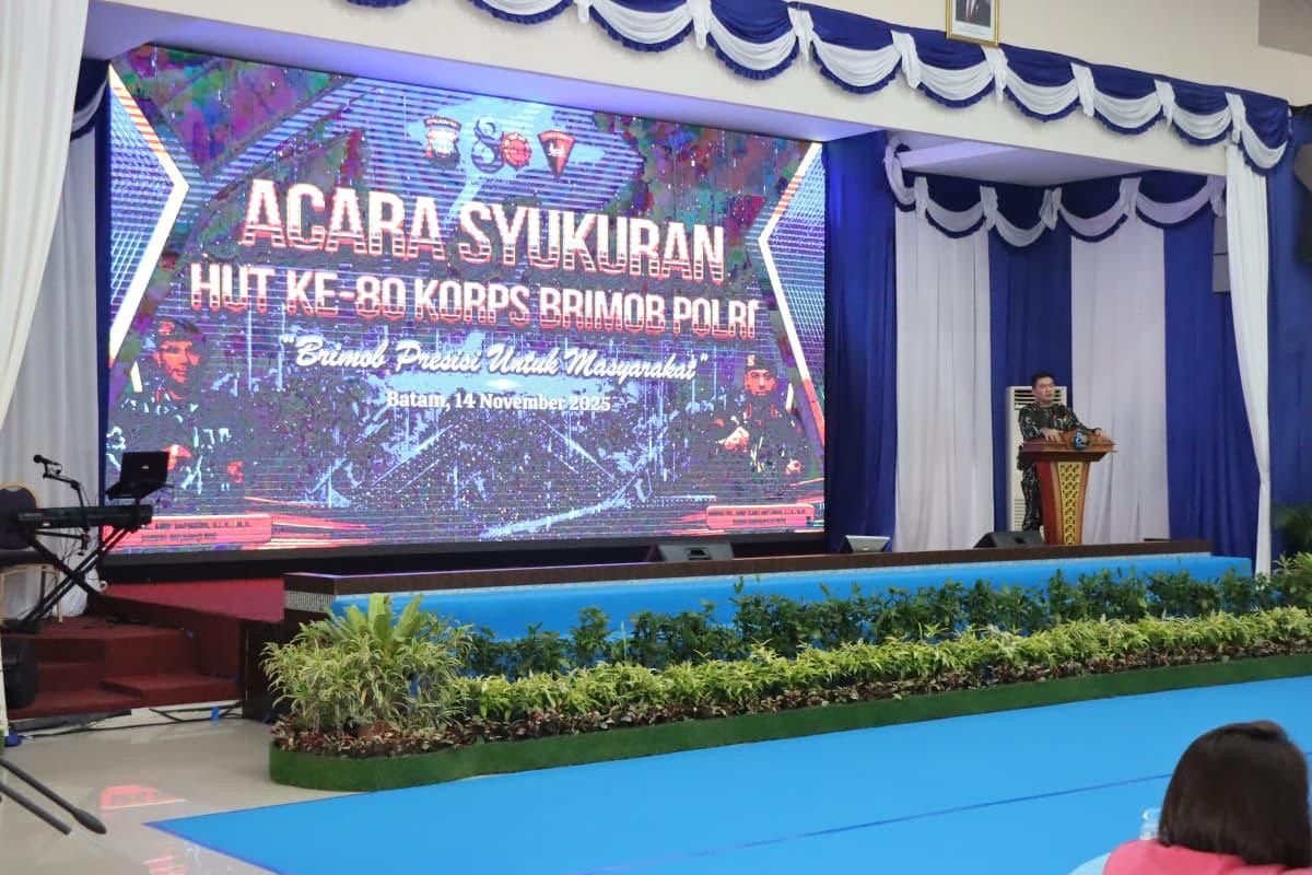 Headline.co.id, Batam ~ Polda Kepulauan Riau (Kepri) menggelar acara syukuran dalam rangka memperingati Hari Ulang Tahun ke-80 Korps Brimob Polri tahun 2025. Acara ini berlangsung di Gedung Lancang Kuning (GLK) Polda Kepri, Batam, dan dihadiri oleh Wakapolda Kepri Brigjen Pol. Dr. Anom Wibowo, S.I.K., M.Si., serta sejumlah pejabat penting lainnya. Hadir pula Deputi V BP Batam, Dirpam Aset BP Batam, Irwasda Polda Kepri, pejabat utama Polda Kepri, purnawirawan, warakawuri, tokoh agama, tokoh masyarakat, dan personel Satbrimob Polda Kepri.