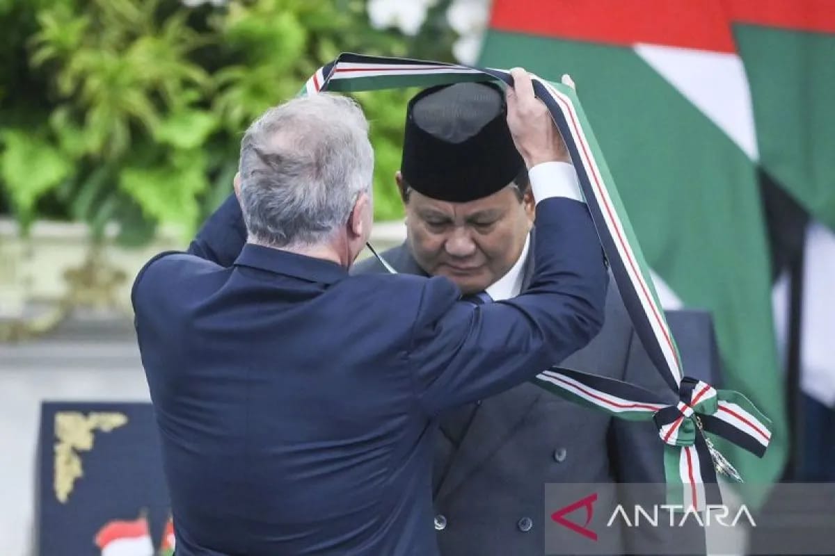 Headline.co.id, Jakarta ~ Presiden Prabowo Subianto menerima medali kehormatan tertinggi dari Raja Kerajaan Yordania Hasyimiah, Raja Abdullah II ibn Al Hussein, dalam sebuah upacara di Istana Merdeka, Jakarta. Medali yang dikenal sebagai Order of the Renaissance ini merupakan penghargaan paling bergengsi yang diberikan oleh Raja Abdullah II. Dalam prosesi penyerahan, Raja Abdullah II menyelempangkan medali tersebut di bahu kanan Presiden Prabowo, diikuti dengan saling bersalaman dan berpelukan.