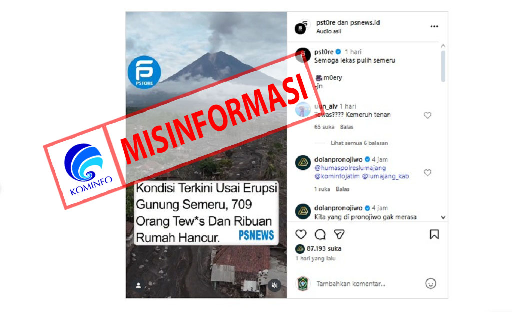 Headline.co.id, Lumajang ~ Sebuah video yang diunggah di media sosial Instagram oleh akun @pst0re menyebutkan bahwa 709 orang tewas dan ribuan rumah hancur akibat erupsi Gunung Semeru. Informasi ini telah dikonfirmasi sebagai tidak benar dan termasuk dalam kategori misinformasi.