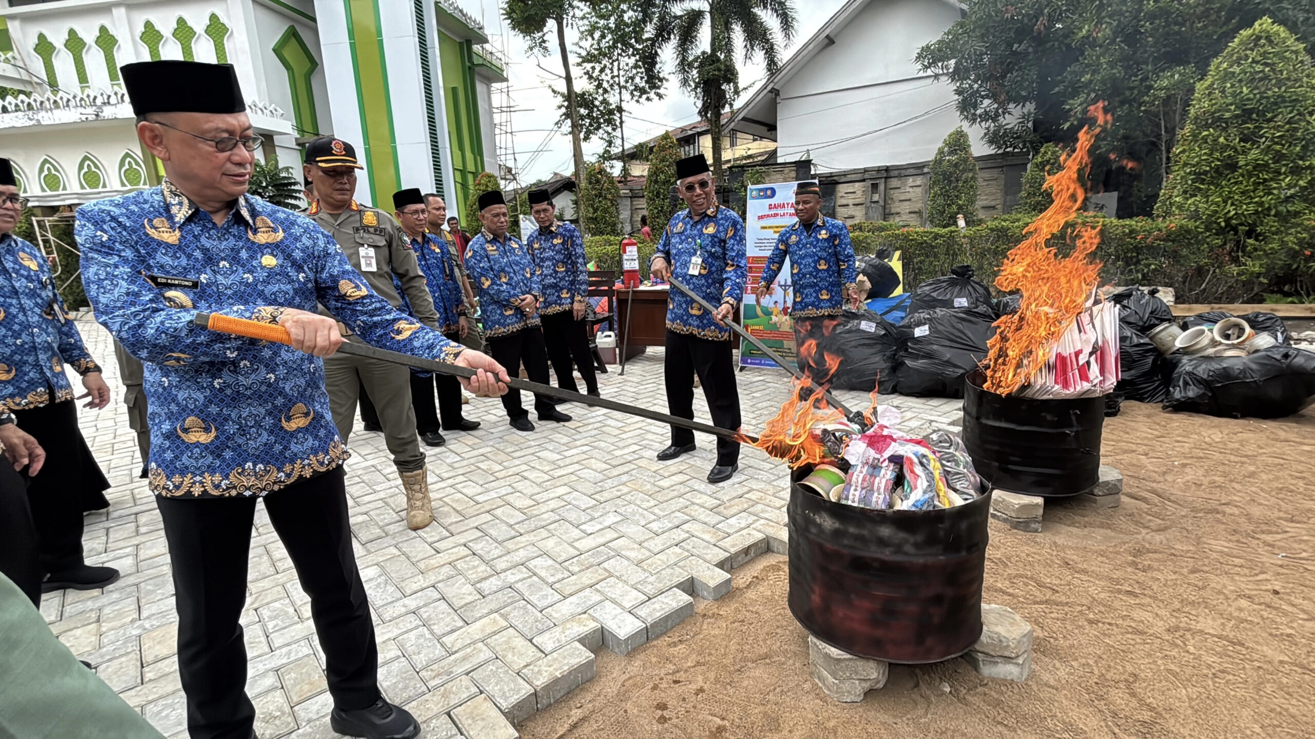 Headline.co.id, Pontianak ~ Sebanyak 3.560 layangan berbagai ukuran dimusnahkan dengan cara dibakar di halaman Kantor Wali Kota Pontianak. Pemusnahan ini dilakukan secara simbolis oleh Wali Kota Pontianak, Edi Rusdi Kamtono, pada Jumat (28/11/2025). Barang-barang tersebut merupakan hasil sitaan Satpol PP Kota Pontianak dari tahun 2020 hingga 2025.