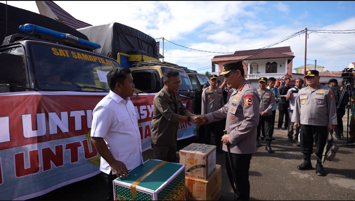 Sebagai bentuk kehadiran negara, Kapolri menyerahkan secara simbolik delapan truk bantuan ‘Polri untuk Masyarakat’ yang berisi bahan makanan, pakaian, dan kebutuhan sehari-hari kepada Bupati Tapanuli Tengah, Masinton Pasaribu. Bantuan tersebut langsung didistribusikan ke posko pengungsian warga terdampak banjir di GOR Pandan, Tapanuli Tengah. “Kami pastikan seluruh upaya penanganan bencana di Sumatera Utara berjalan cepat, terkoordinasi, dan berpihak pada kebutuhan masyarakat yang paling terdampak,” ungkap Kapolri.