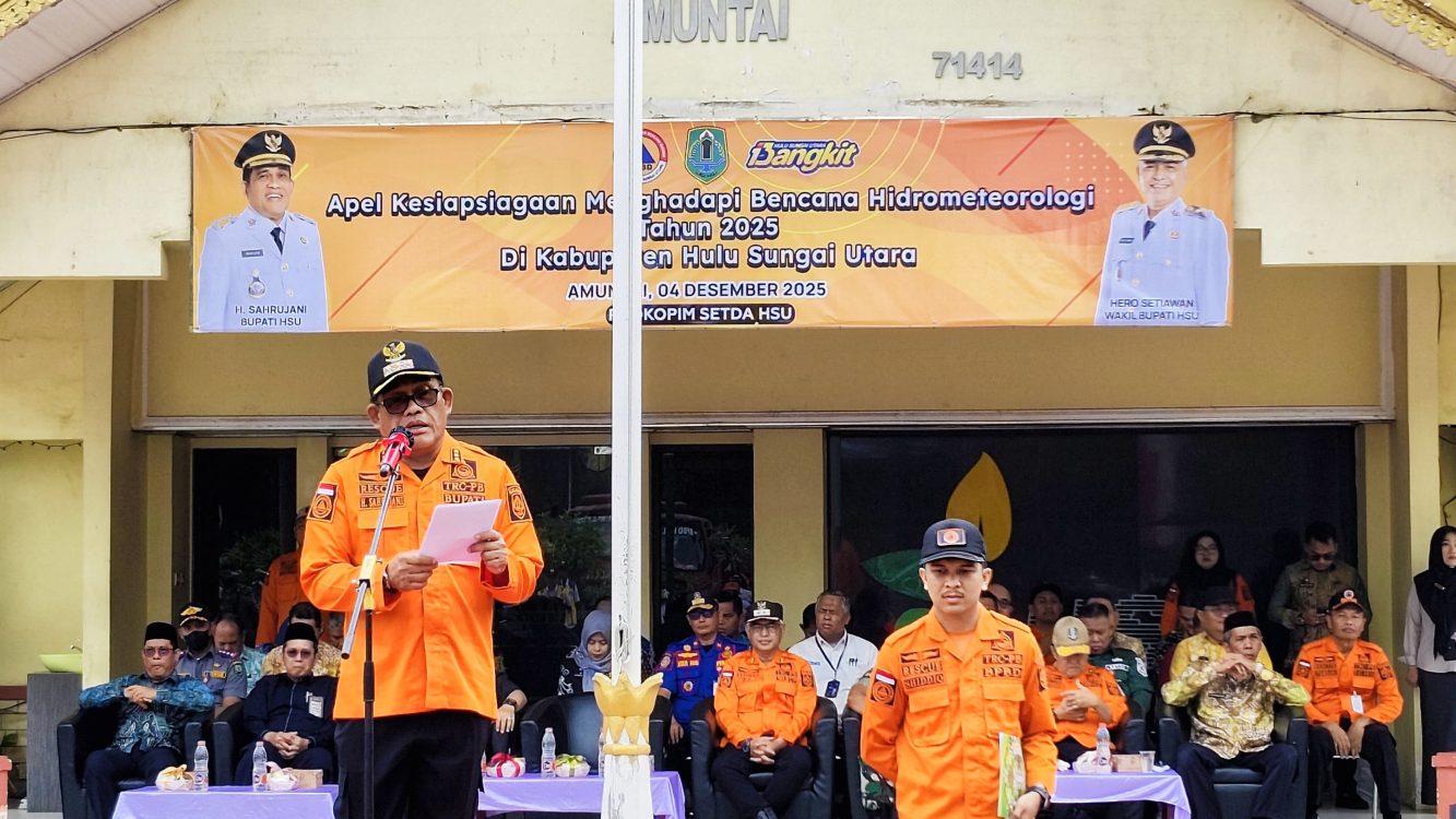 Headline.co.id, Hulu Sungai Utara ~ Pemerintah Kabupaten Hulu Sungai Utara (HSU) mengadakan Apel Kesiapsiagaan Menghadapi Bencana Hidrometeorologi Tahun 2025. Acara ini berlangsung di halaman Kantor Bupati HSU pada Kamis, 4 Desember 2025. Tujuan dari kegiatan ini adalah untuk mengantisipasi potensi bencana hidrometeorologi, terutama banjir, yang kerap melanda wilayah tersebut setiap musim penghujan.