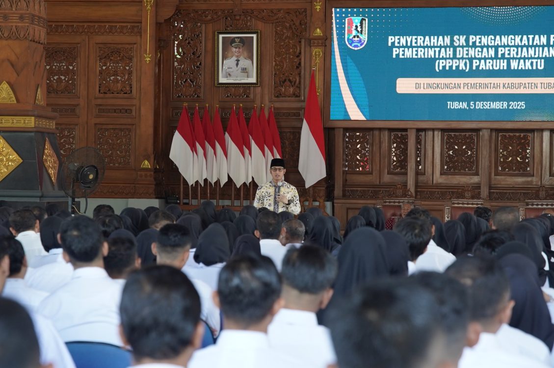 Headline.co.id, Tuban ~ Bupati Tuban secara resmi menyerahkan Surat Keputusan (SK) Pegawai Pemerintah dengan Perjanjian Kerja (PPPK) Paruh Waktu kepada 693 pegawai. Acara penyerahan ini berlangsung pada Jumat (5/12/2025) di Pendapa Krida Manunggal Tuban. Langkah ini merupakan bagian dari upaya memperkuat tenaga administrasi dan layanan operasional di lingkungan Pemerintah Kabupaten Tuban.