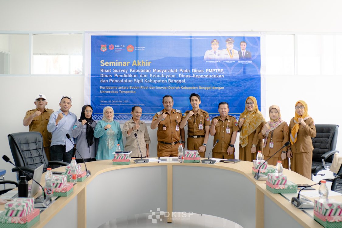 Headline.co.id, Banggai ~ Badan Riset dan Inovasi Daerah (BRIDA) Kabupaten Banggai telah menyelesaikan Seminar Akhir Riset Survey Kepuasan Masyarakat yang menargetkan tiga perangkat daerah, yaitu Dinas PMPTSP, Dinas Pendidikan dan Kebudayaan, serta Dinas Kependudukan dan Pencatatan Sipil. Seminar ini diadakan di Ruang Rapat BRIDA pada Selasa (02/12/2025) dan bertujuan untuk mengevaluasi strategi peningkatan kualitas layanan publik.