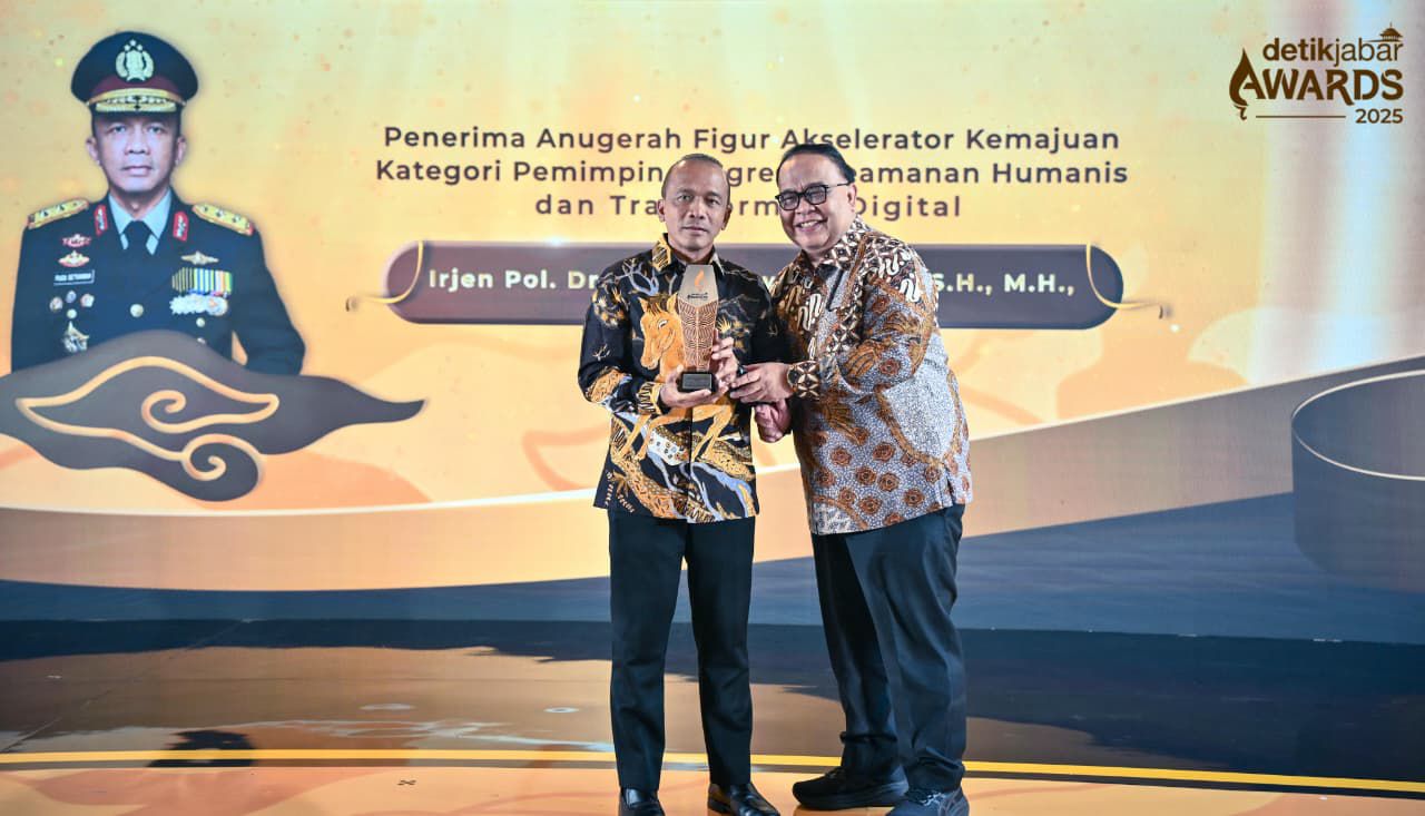 Headline.co.id, Bogor ~ Kapolda Jawa Barat, Irjen Pol Rudi Setiawan, menerima penghargaan dalam acara detikJabar Award 2025 yang berlangsung di Hotel Salak The Heritage, Kota Bogor, pada Rabu (10/12/2025). Penghargaan tersebut diserahkan langsung oleh Direktur Transmedia, Latif Harnoko, kepada Irjen Rudi sebagai bentuk apresiasi atas inovasi yang telah diterapkannya di Polda Jabar.