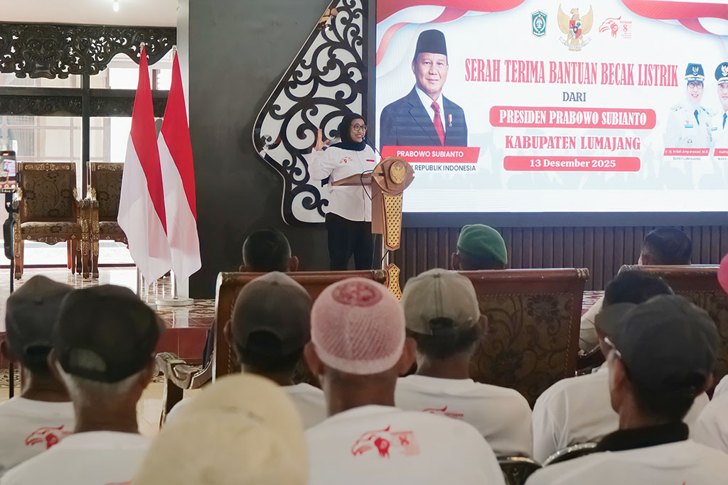 Headline.co.id, Lumajang ~ Pemerintah Kabupaten Lumajang menekankan pentingnya pemanfaatan becak listrik yang disalurkan kepada tukang becak agar tepat guna. Wakil Ketua Umum Yayasan Gerakan Solidaritas Nasional, Nanik S Deyang, menegaskan bahwa becak listrik yang diberikan tidak boleh diperjualbelikan. Pernyataan ini disampaikan dalam acara penyerahan 100 unit becak listrik secara simbolis di Pendopo Arya Wiraraja, Kabupaten Lumajang, pada Sabtu (13/12/2025).